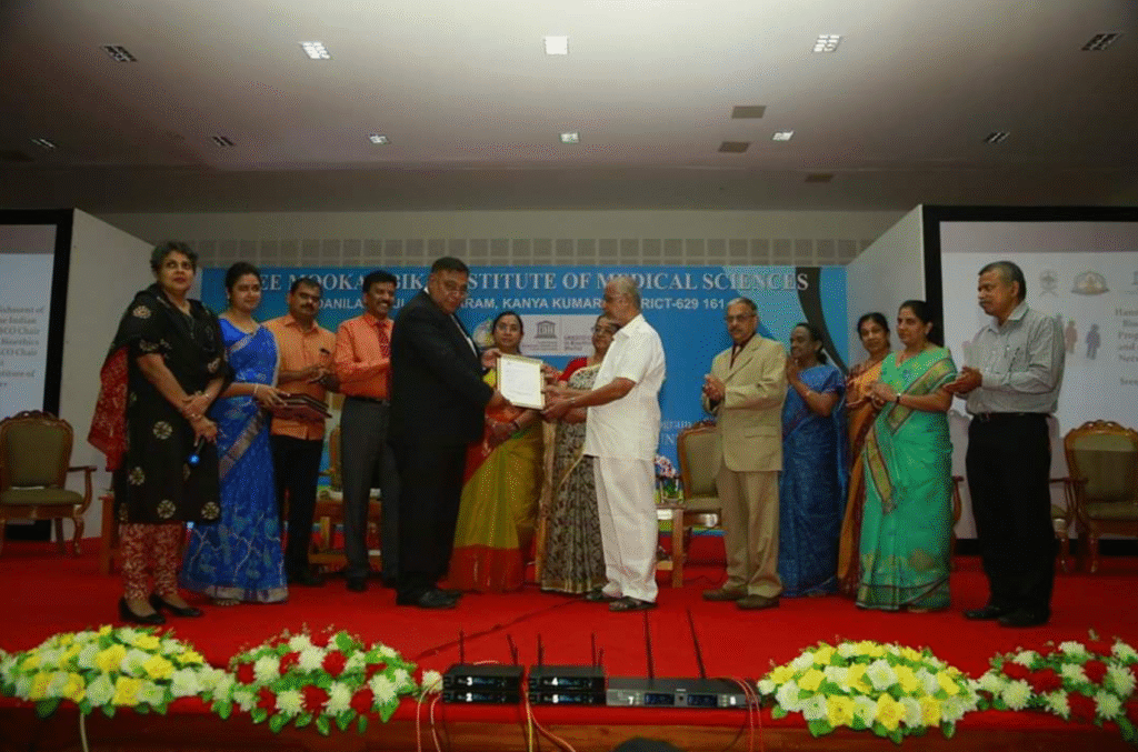 Prof. Dr. Russell DSouza handing over the writ to our Chairman for the establishment of UNESCO Bioethics Units and its accreditation at SMIMS