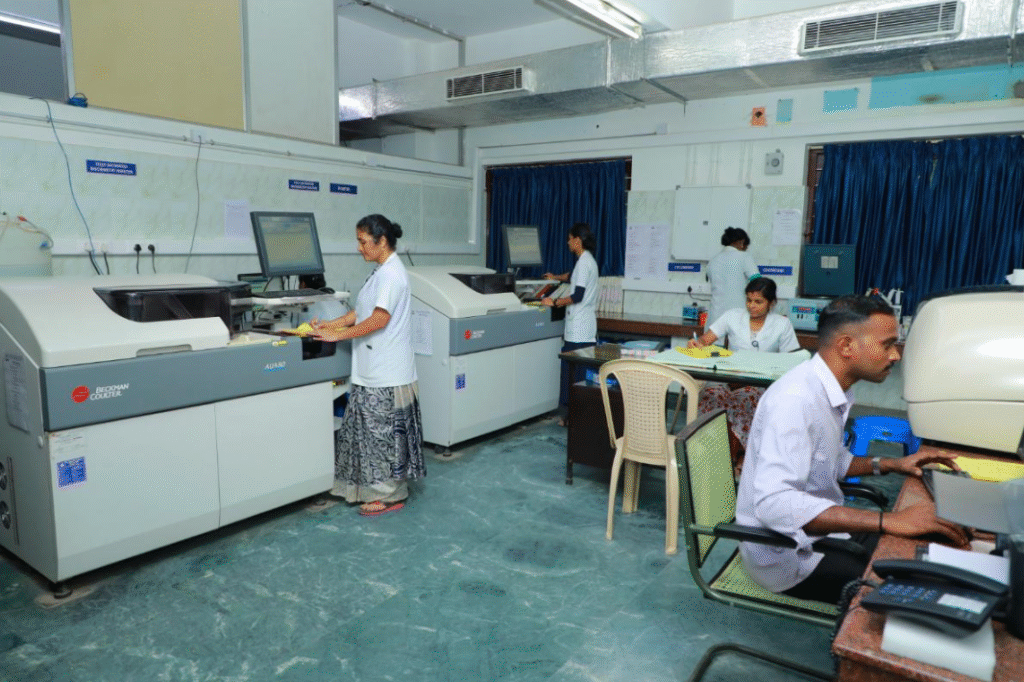 The Central Laboratory features a spacious blood collection area and dedicated sections for Biochemistry, Clinical Pathology, Hematology, and Microbiology. It is equipped with fully automated analysers, cell counters, and culture identification systems, with specimens handled by qualified technicians and reported by authorized staff. Integrated with LIS and HIS, results are instantly accessible in patient care areas, while strict quality control and assurance systems ensure accuracy. The lab also includes an ICMR- and NABL-accredited Virology (RT-PCR BSL II) facility, with staff undergoing regular training to maintain technical expertise.