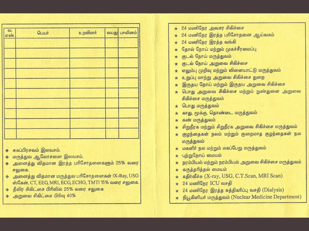 Right from the days of Velayudhan Nair Memorial Hospital, the Chairman and Director have been sensitive to the community needs of the region inTamil Nadu and Kerala and voluntarily taken part in providing relief measures for victims of flood, Tsumani, and other natural disasters. This has been in money and kind. More details are available in the Community Outreach section.