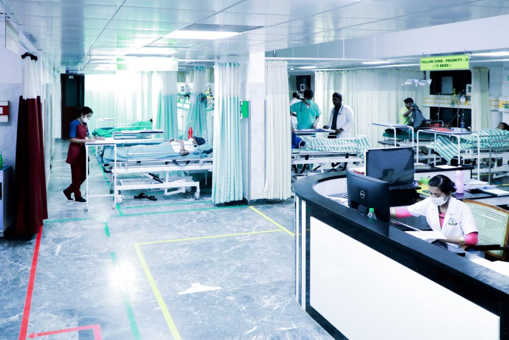 The Department of Emergency Medicine, upgraded from a 24-bedded Casualty to a 30-bedded facility in July 2021, functions round-the-clock with advanced equipment to handle all kinds of medical, surgical, and trauma emergencies. It houses 24 triage beds (Red Zone – 4, Yellow Zone – 15, Green Zone – 5), a 6-bedded Emergency ICU, and a fully equipped Modular OT.