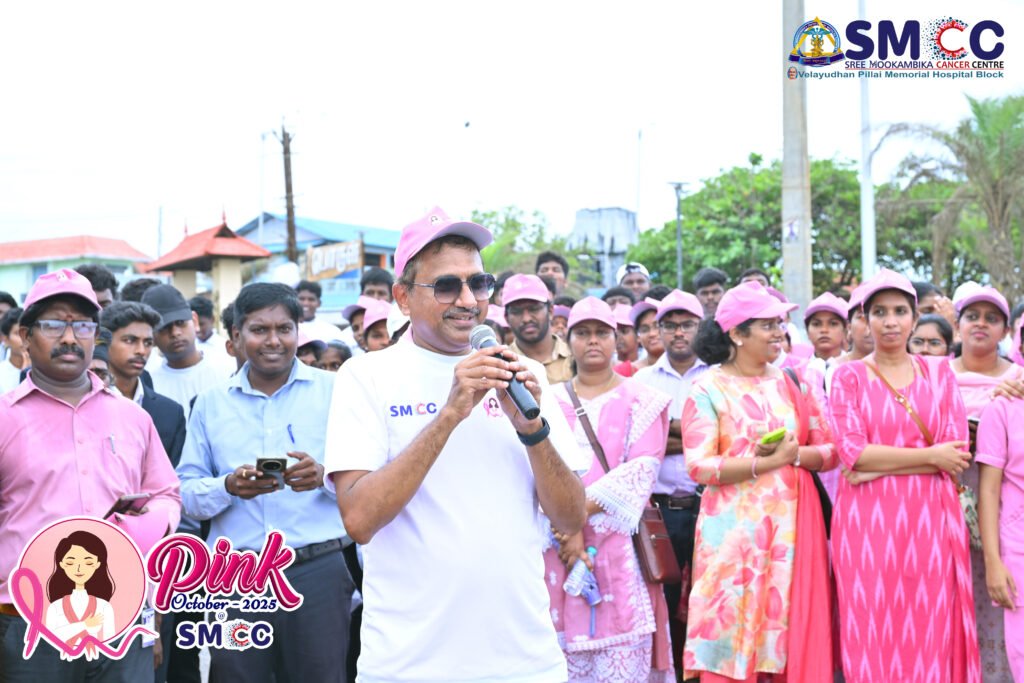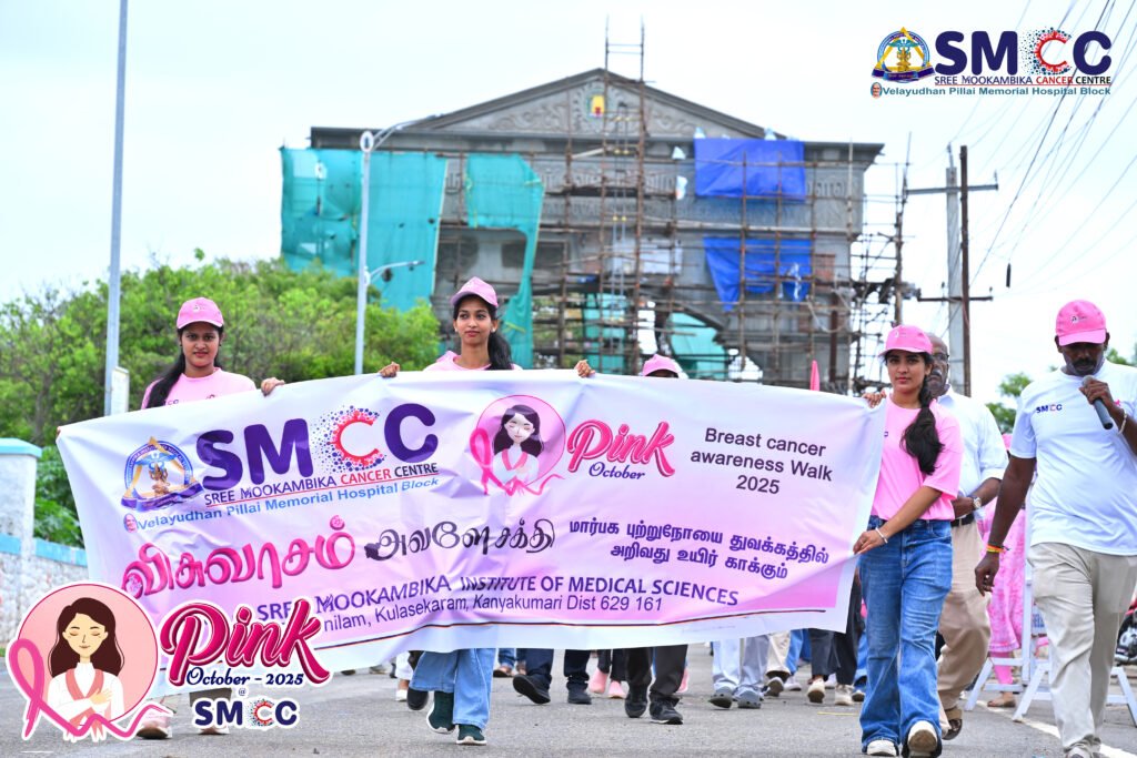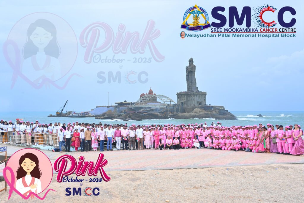 During Breast Cancer Awareness Month, Sree Mookambika Institute of Medical Sciences conducted a wide range of awareness, screening, and community outreach activities, creating a significant public health impact. A 31-day digital awareness drive was carried out through daily videos, reaching over 7.8 million views online. The campus was illuminated in pink with a Pink Ribbon installation, symbolizing solidarity in the fight against breast cancer. Seven free breast cancer screening camps were organized, benefiting 1,065 women, while awareness campaigns were conducted across seven colleges (2,307 participants), two schools (536 participants), and community programs benefiting 323 people. Throughout the month, free mammogram services were provided for 30 days, benefiting 144 women. The initiative also included a Pink Pledge led by cancer warriors and supporters (1,277 participants) and Pink Pledge Certificates issued digitally to 1,431 participants. A Pink Walkathon – United for Hope saw 650 participants, and a Flash Mob on Breast Cancer Awareness engaged over 400–550 participants. The campaign further featured India’s first AI-generated breast cancer awareness video, along with inspiring events such as the “Dance of Hope” (1,277 participants) and the “Light of Hope” ceremony organized by SMCC with 400 participants.